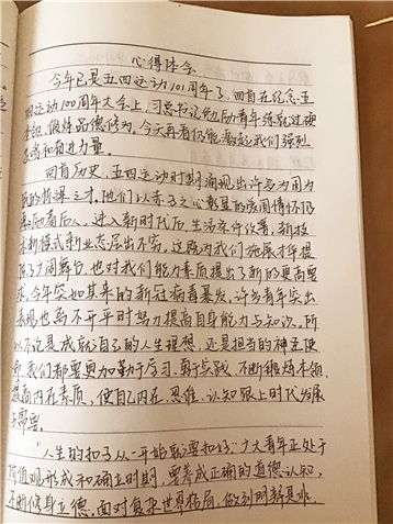 焕发青春活力,展现青年光彩”—— 党支部利用“学习强国”学习平台,认真学习习近平总书记在纪念五四运动100周年大会上的重要讲话,大家记录并分享自己的感悟体会。“五四不仅是一种运动,更是一种精神。”正如学生党员韩璐瑶心得体会所言:疫情期间对五四精神理解更加深刻,在今后更要发挥自己所有力量,甘于奉献,承担青年的使命责任。