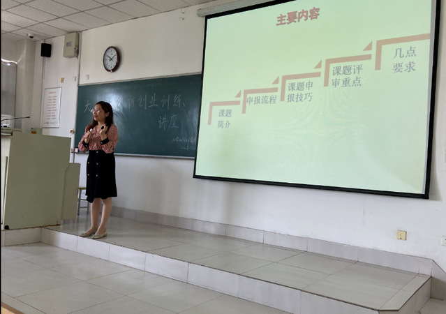 胡善菊老师首先向同学们介绍了2022年度国家级、省级、校级大学生创新创业训练计划项目的基本情况、参赛流程、注意事项。然后结合自己的指导经验,向同学们介绍了大创项目的申报流程、申报技巧、评审要点、注意事项,重点强调了团队合作、选题、研究内容、技术路线的重要性。胡善菊老师特别指出,大创计划的申报考验项目主持人对全局的掌控力和责任感,要求项目负责人要具有较高的责任意识和担当能力,在项目进行中应该及时与指导老师进行沟通与交流,及时发现问题、解决问题,提高申报效率。最后,胡善菊老师向与会师生展示了往届学长学姐们的优秀标书,号召同学们向优秀学长学姐们学习,积极参加各级各类大学生创新创业活动,积极通过课题申报、课题研究、团队合作锻炼自己、提升自己。