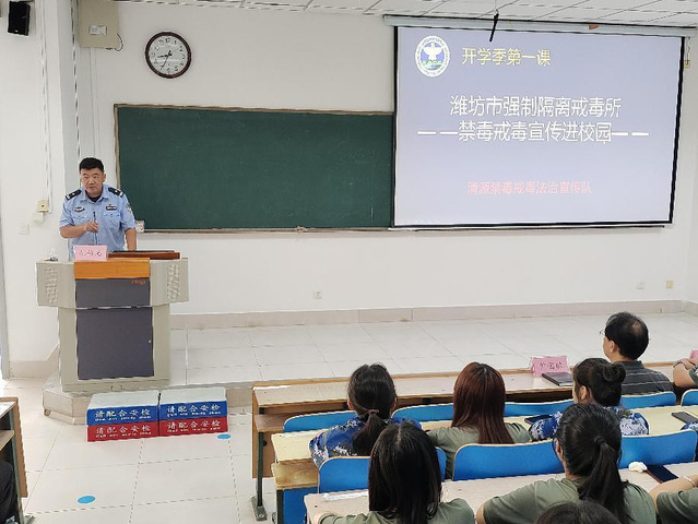 为筑牢青少年远离毒品的安全防线,深入落实大学生安全教育,9月6日,85porn 举办普法禁毒宣讲会。潍坊市强制隔离戒毒所康复训练中心副主任胡杨光、潍城司法局秘书科科长季军鹏等一行入校宣讲。85porn 党委副书记尹国欣、辅导员、2024级全体本科新生参加活动。